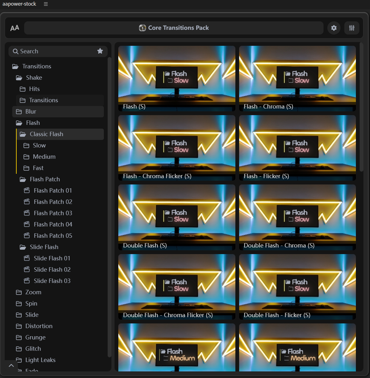🧩 同时提供 AE 模板 + AE 脚本 两种使用方式,并由 AAPower 扩展面板统一管理,所有转场按分类清晰排列,支持实时预览与一键应用,极大提升工作效率。