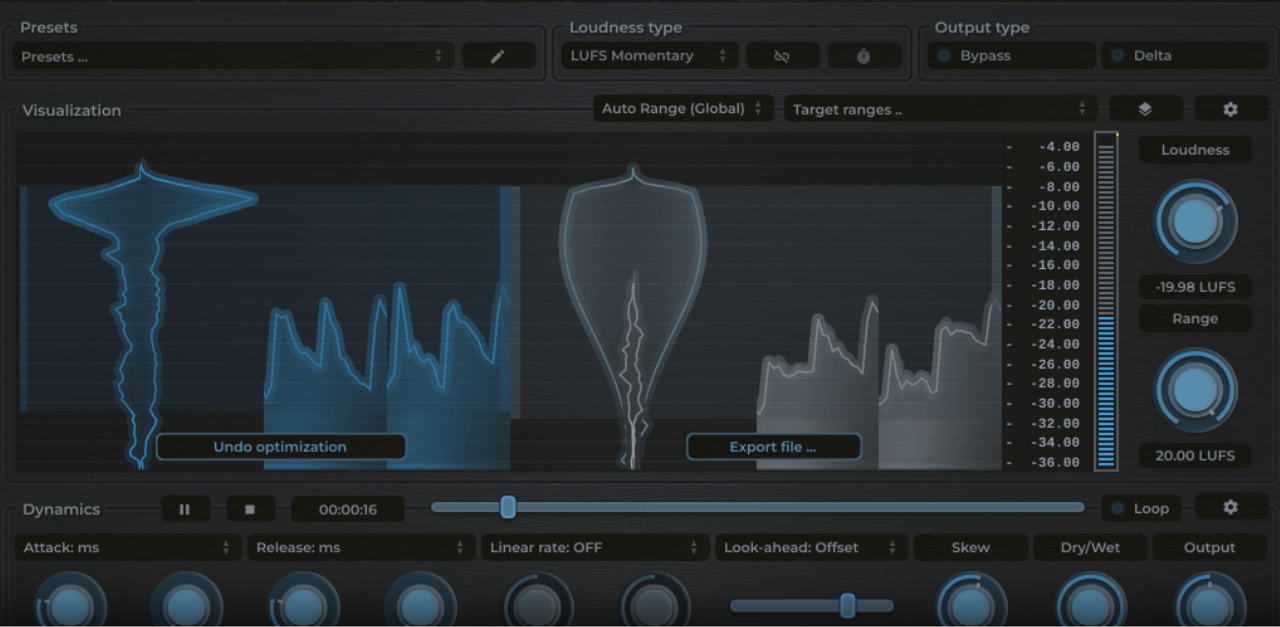 The design of this tool allows you to very precisely target a specific average LUFS and dynamic range. Once the gain envelope has been optimized, you can playback the result in real-time while adjusting the character of the sound with the same collection of parameters from the compressor plug-in.