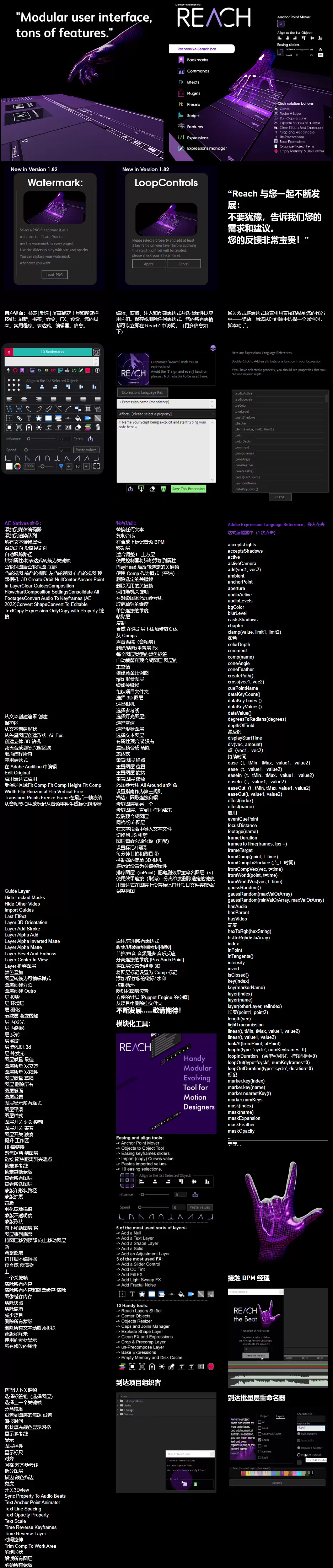 REACH Pro 是一款 After Effects 高效工作流增强脚本。它将命令、效果、脚本、表达式及实用工具整合到可搜索、可收藏的统一界面,支持快速查找和一键执行。